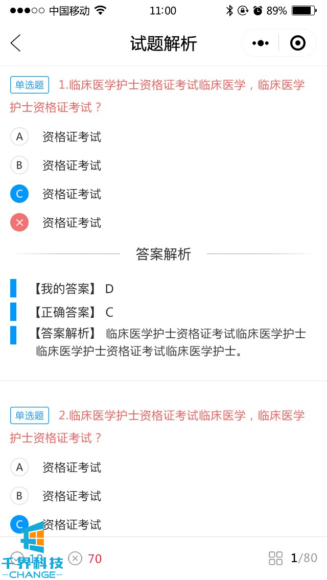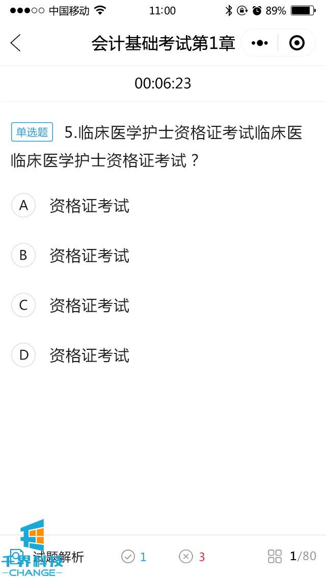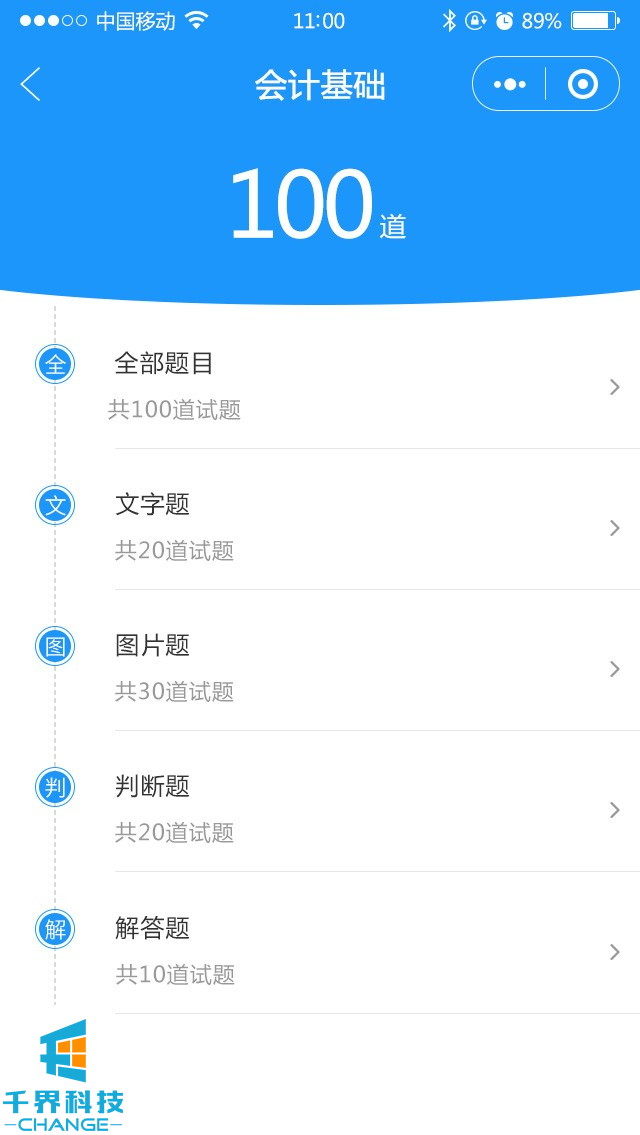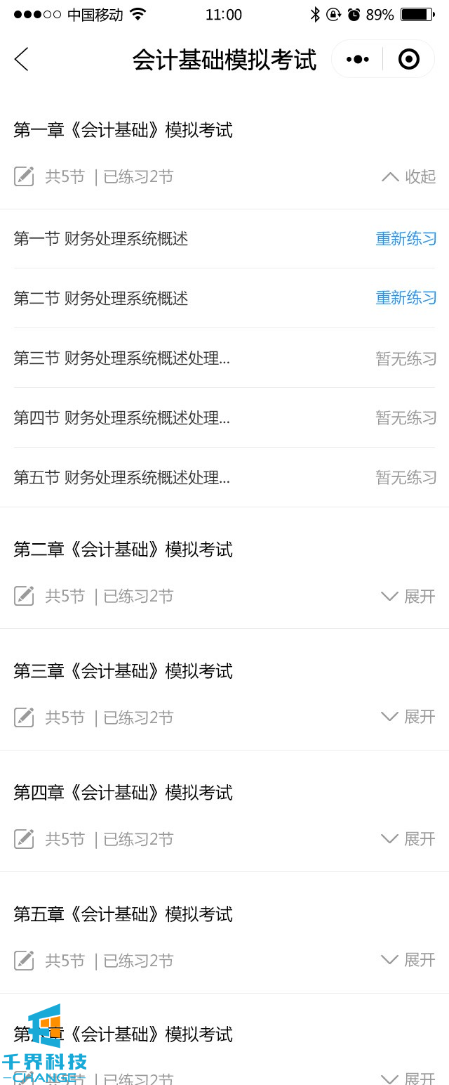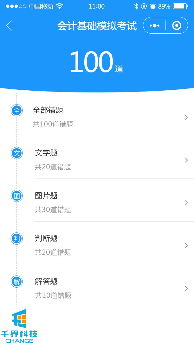 包含模擬考試,提交答題卡,然后出考試成績(jì),試題解析,章節練習,錯題集錦,題型選擇
