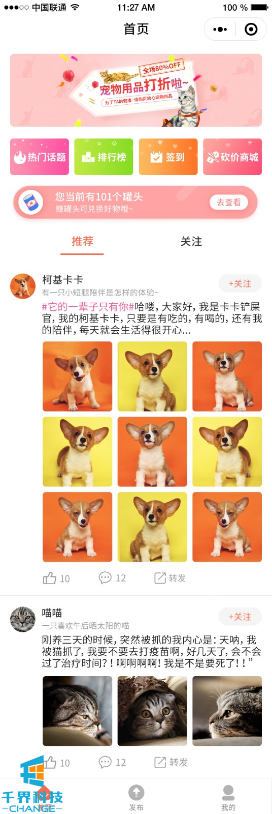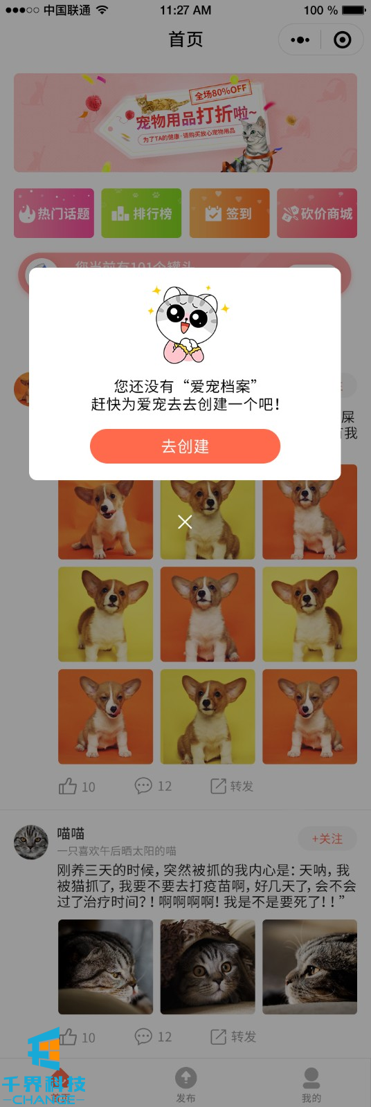 該項目是一個(gè)在線(xiàn)寵物社區交友平臺。里面包含寵物社交,在線(xiàn)發(fā)布,話(huà)題打卡,積分排行,在線(xiàn)簽到,砍價(jià)商城等功能。
