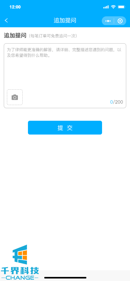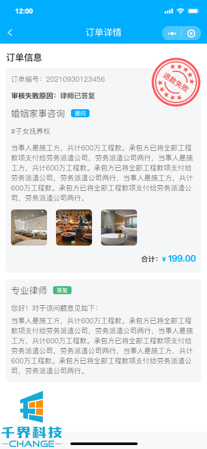 該項目是一個(gè)法律咨詢(xún)平臺,用戶(hù)圖文描述自己的問(wèn)題,選擇不同的咨詢(xún)檔次進(jìn)行提交,后臺可分配律師,將用戶(hù)需求發(fā)送至對應律師郵箱,之后再由后臺將對應答復回復給用戶(hù),平臺不含律師端口。用戶(hù)可進(jìn)行免費追問(wèn)、升級咨詢(xún)等操作