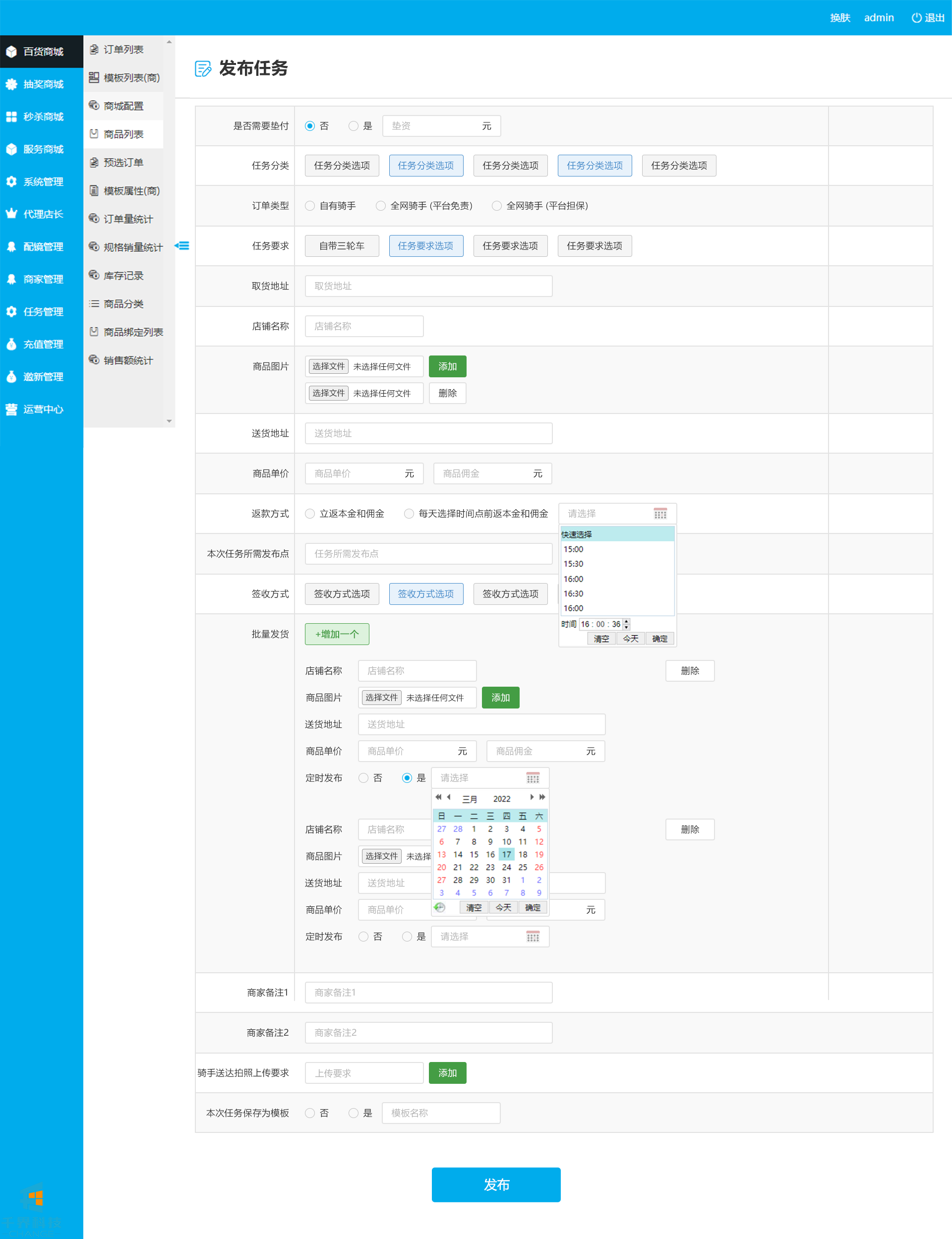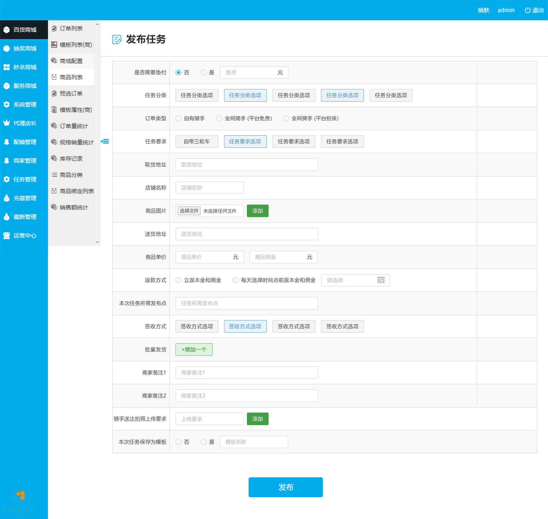 該項目是商家通過(guò)PC后臺發(fā)布跑腿任務(wù),由師傅接單后進(jìn)行送貨,線(xiàn)上無(wú)交易,商家發(fā)布需要消耗對應的平臺通用貨幣