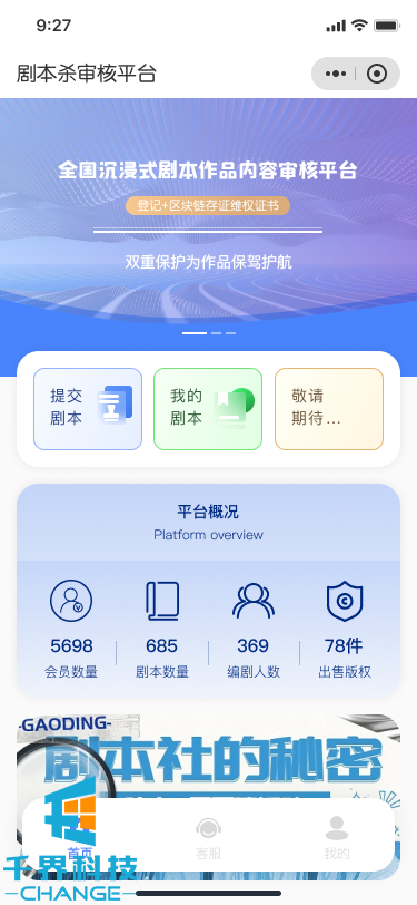 該項目是一個(gè)劇本殺內容審核平臺,采用接口+人工模式進(jìn)行審核劇本,且通過(guò)付費方式進(jìn)確權操作并發(fā)放對應的確權證書(shū)功能的小程序。